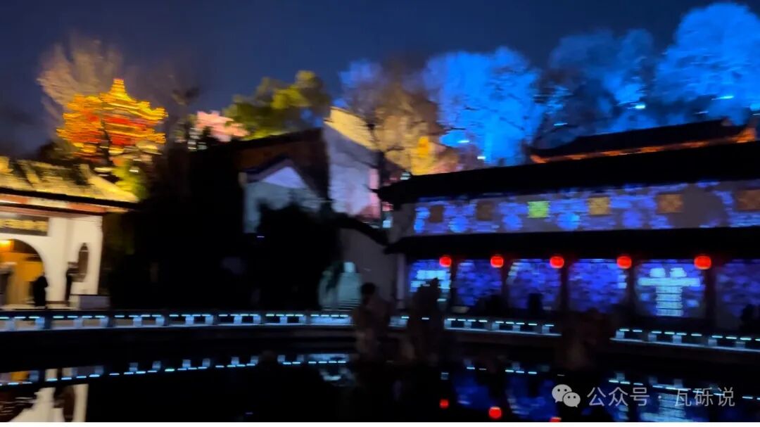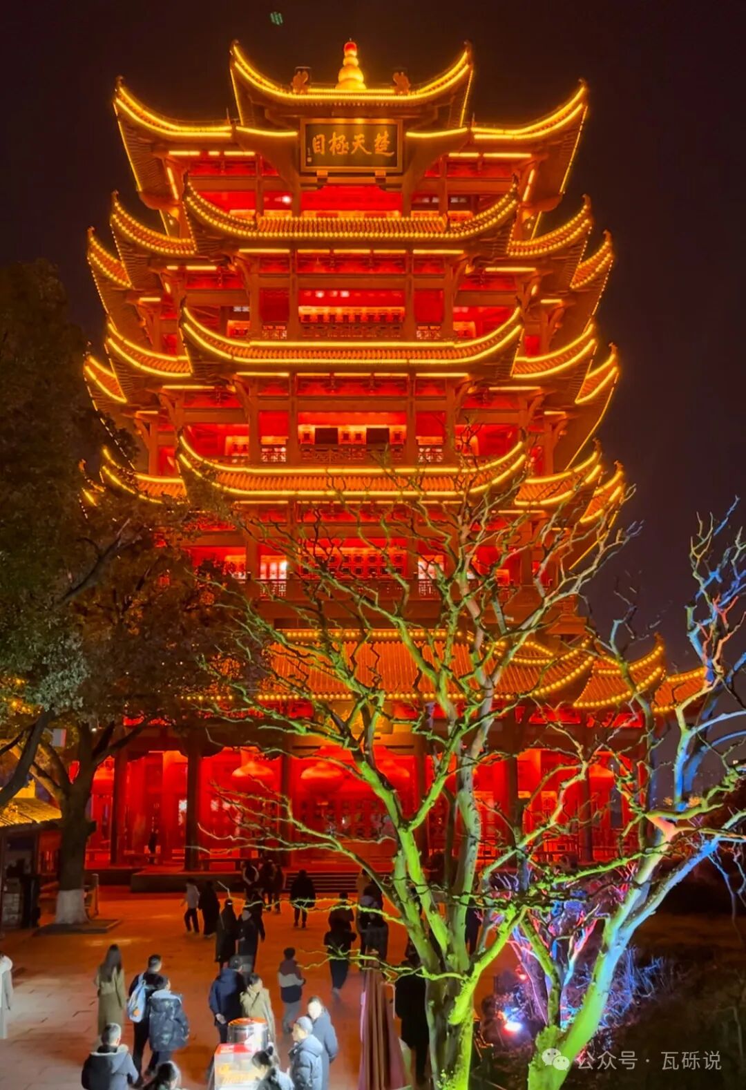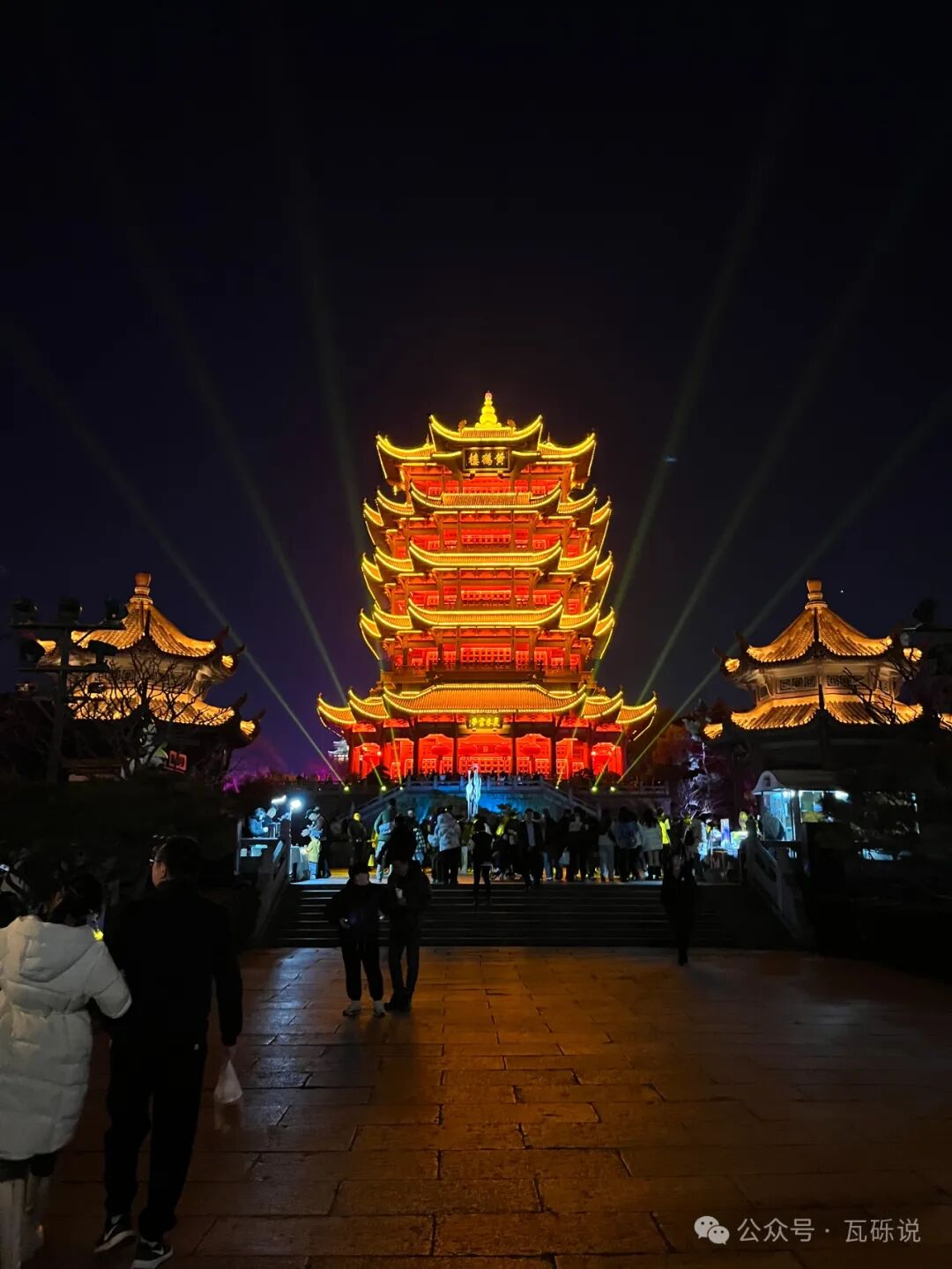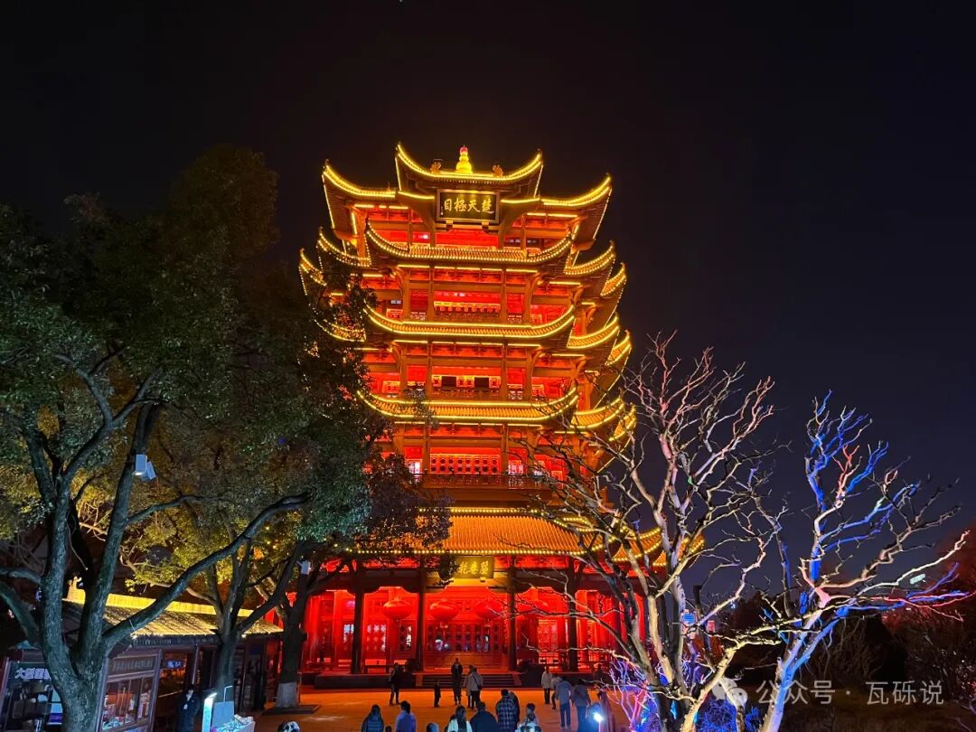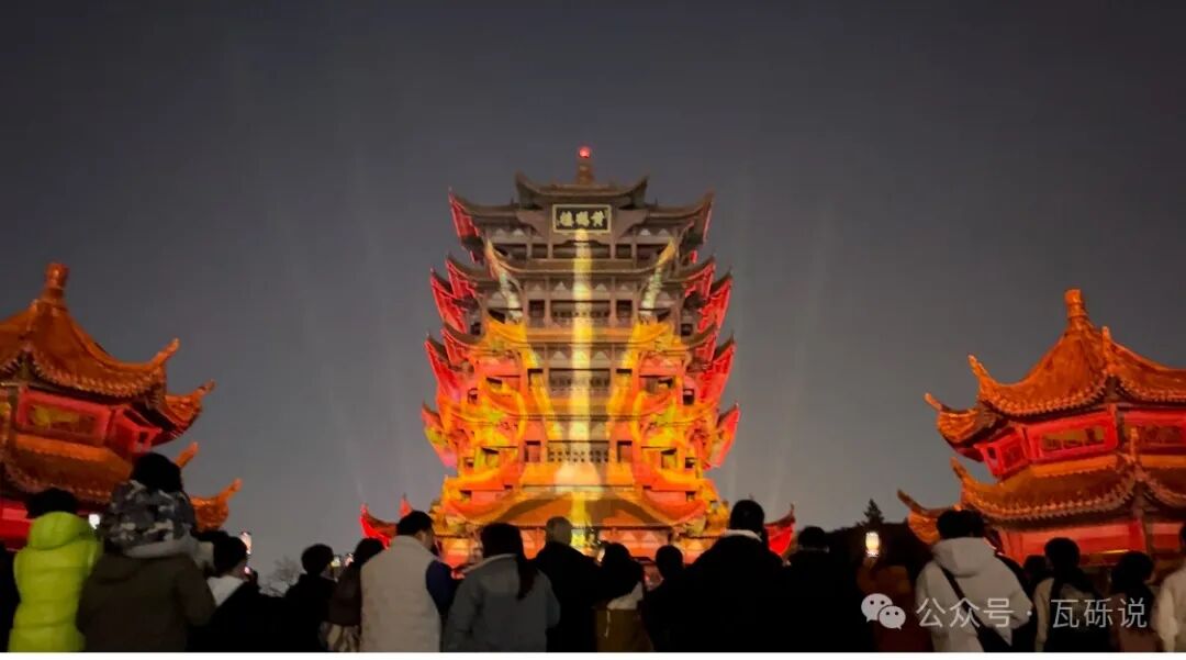 1️⃣黄鹤楼灯光秀,时长10分钟左右,全程需仰头观看。灯光会打在黄鹤楼和左右两边的小楼上,但主要灯光秀内容还是看黄鹤楼上的。工作人员说站远点观看效果好。