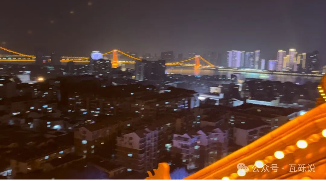 登上黄鹤楼可以看江景,最佳观景位置在楼梯的左边这圈廊下,往右走中间偏右的区域段。其他地方只能看普通夜景。(下图人太多我没挤到最好的位置去,只能侧面拍下江有点潦草了,肉眼看还不错的)