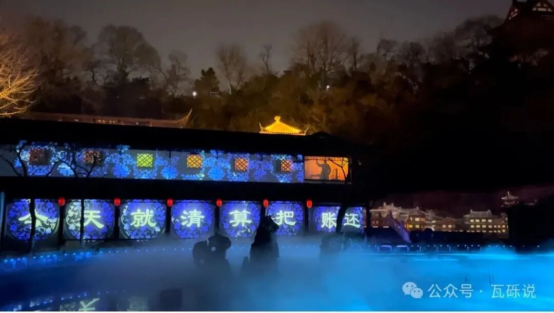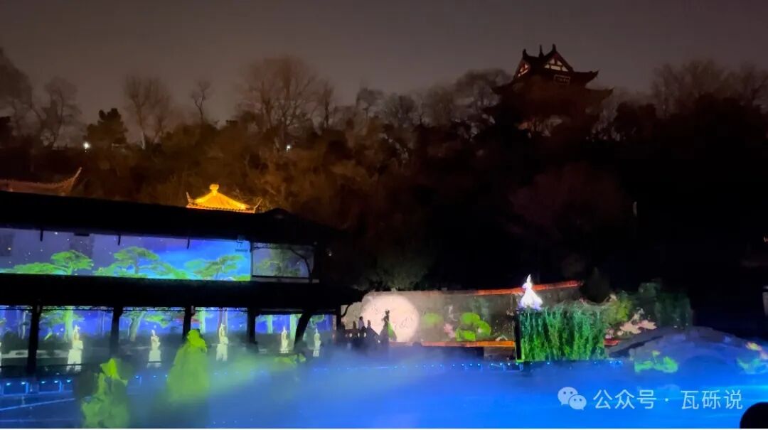有灯光皮影戏和女舞蹈演员的独舞。初时是右手边远处楼阁上红衣女子独舞,隔得很远,有种朦胧的美感。