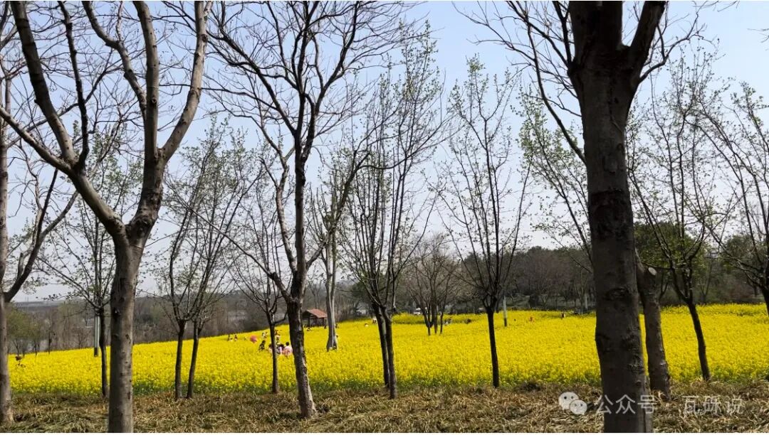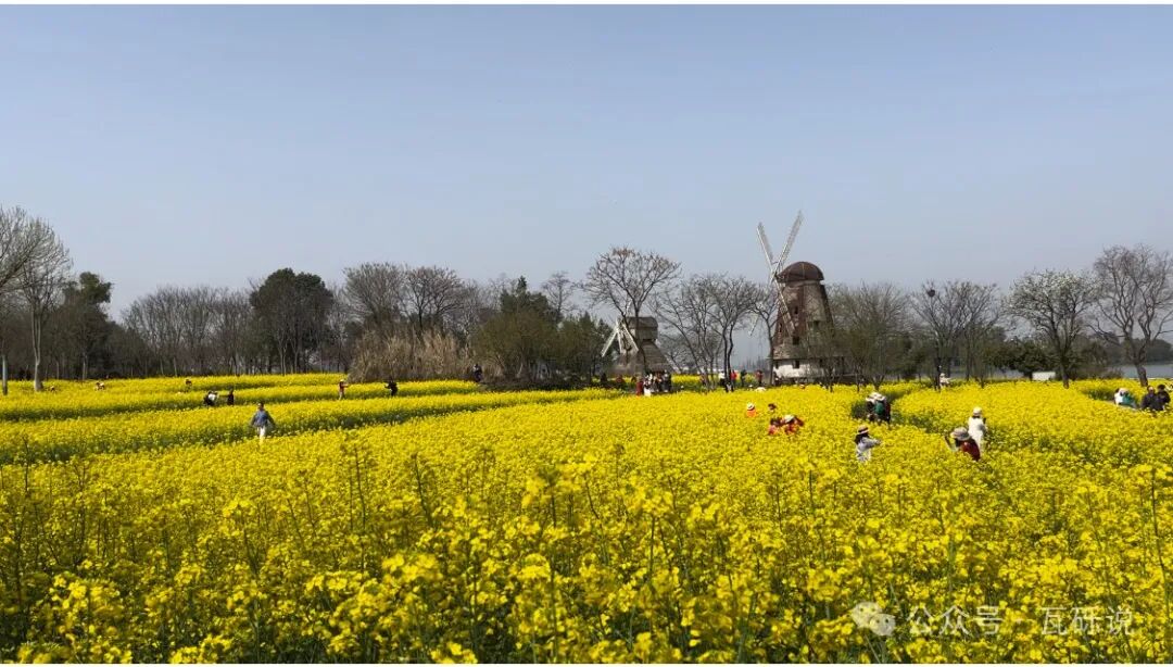 再往前走一点,就是“梯田花海”,挨着湖边金灿灿的超大一片油菜花,风中都是花香。油菜花田里面有两个风车,那里拍照的人最多。花海的空地处可以铺上野餐垫露营,享受春日的极致浪漫。