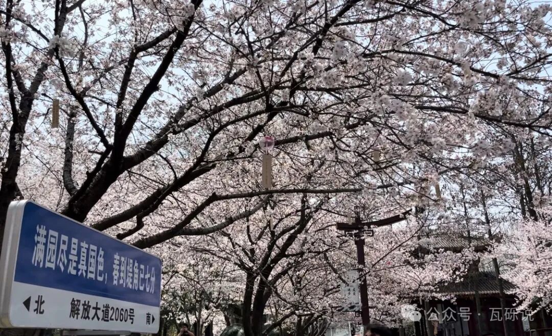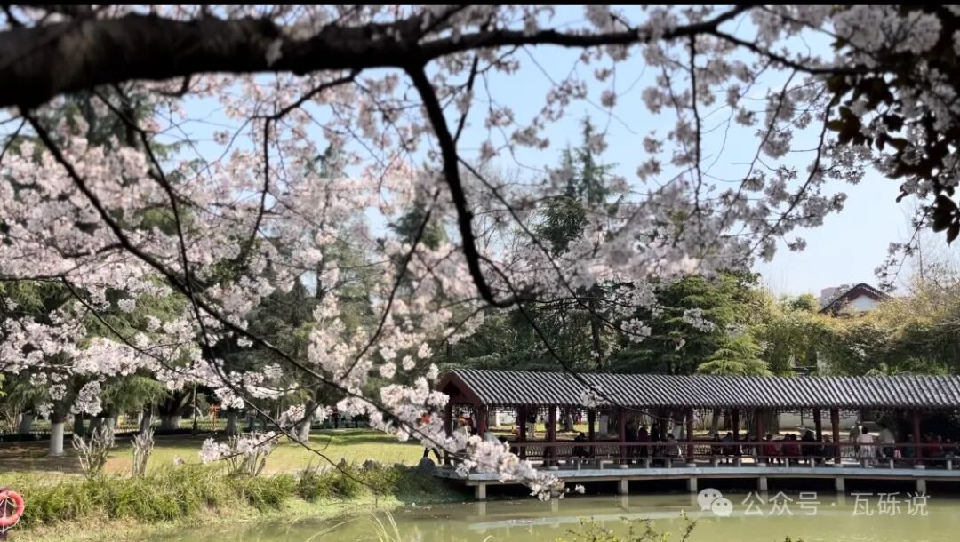南门处是整个公园樱花最多最集中的地方,樱花树高大茂盛,树上系了风铃和信笺,是公园的网红拍照打卡地。这里人比较多,适合拍摄樱花林。