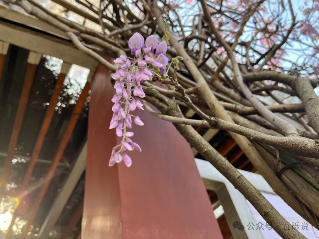 紫藤花的花蔓攀着长廊两侧生长,紫穗悬垂,花繁而香。其花语是:深深的思念和执着的等待。这花语和它的颜色一样浪漫。