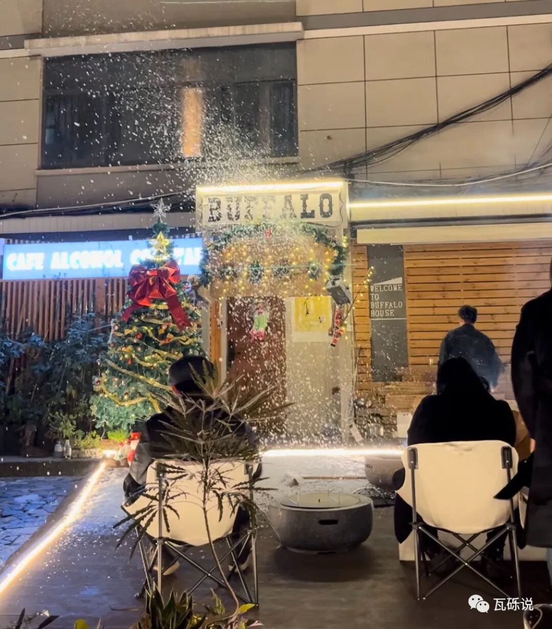 ❄️途经沿江大道科技馆公交站,站牌背后有家店,18:30经过时有人造雪。在旁边圣诞树等装饰的映衬下还是蛮有氛围感的。有路人带着小孩过去玩雪拍照,没有见到老板因此收费。