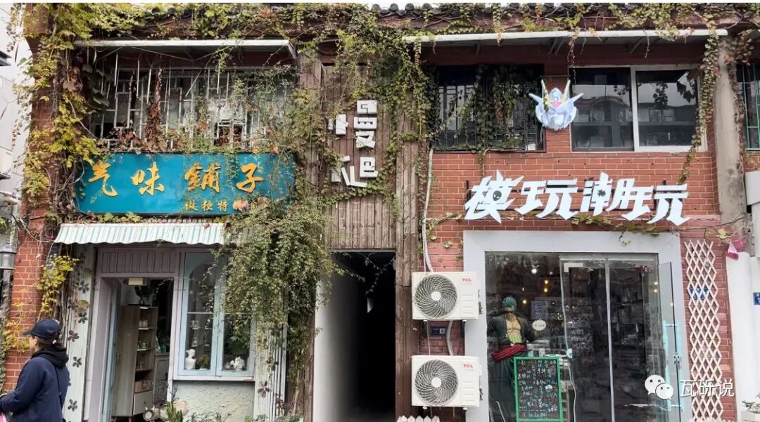 这条街道并不长,我们可以慢慢逛一逛。许多小店门头都挺有意思,复古的、个性新潮的,不同的设计但都任由着植物去缠绕攀爬,增添了一丝野趣。
