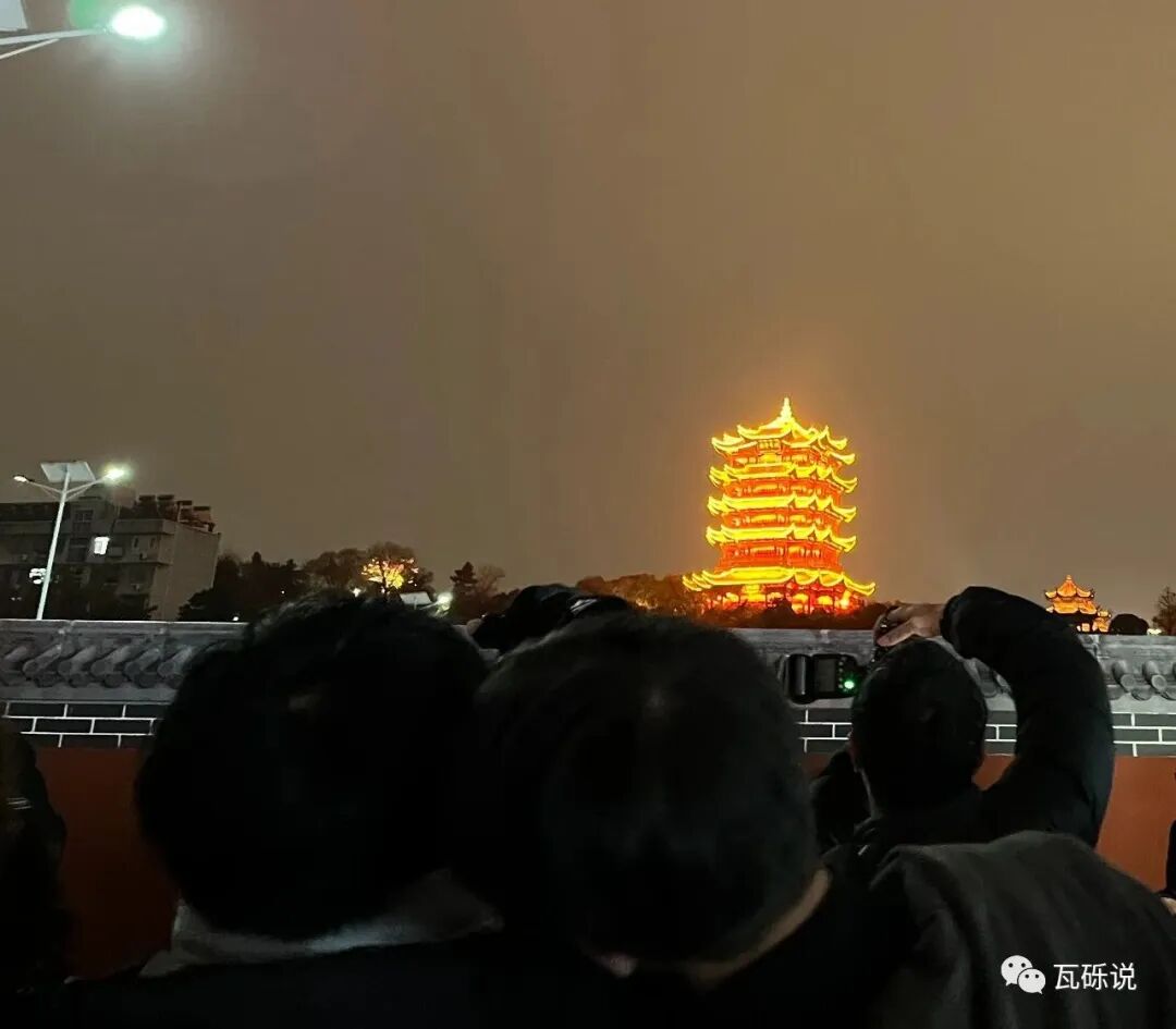 最后一站司门口黄鹤楼地铁站C出口。步行1.3公里,十几分钟。在C出口指示牌旁边有一堵红墙,很多人在这里拍照。站在红墙下,背后是夜色中的黄鹤楼,别有一番韵味。