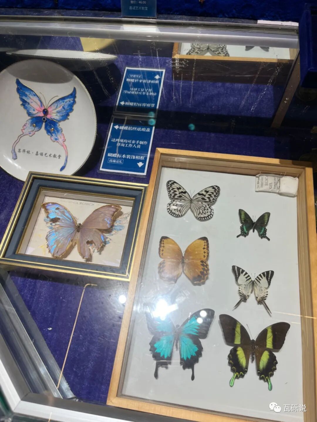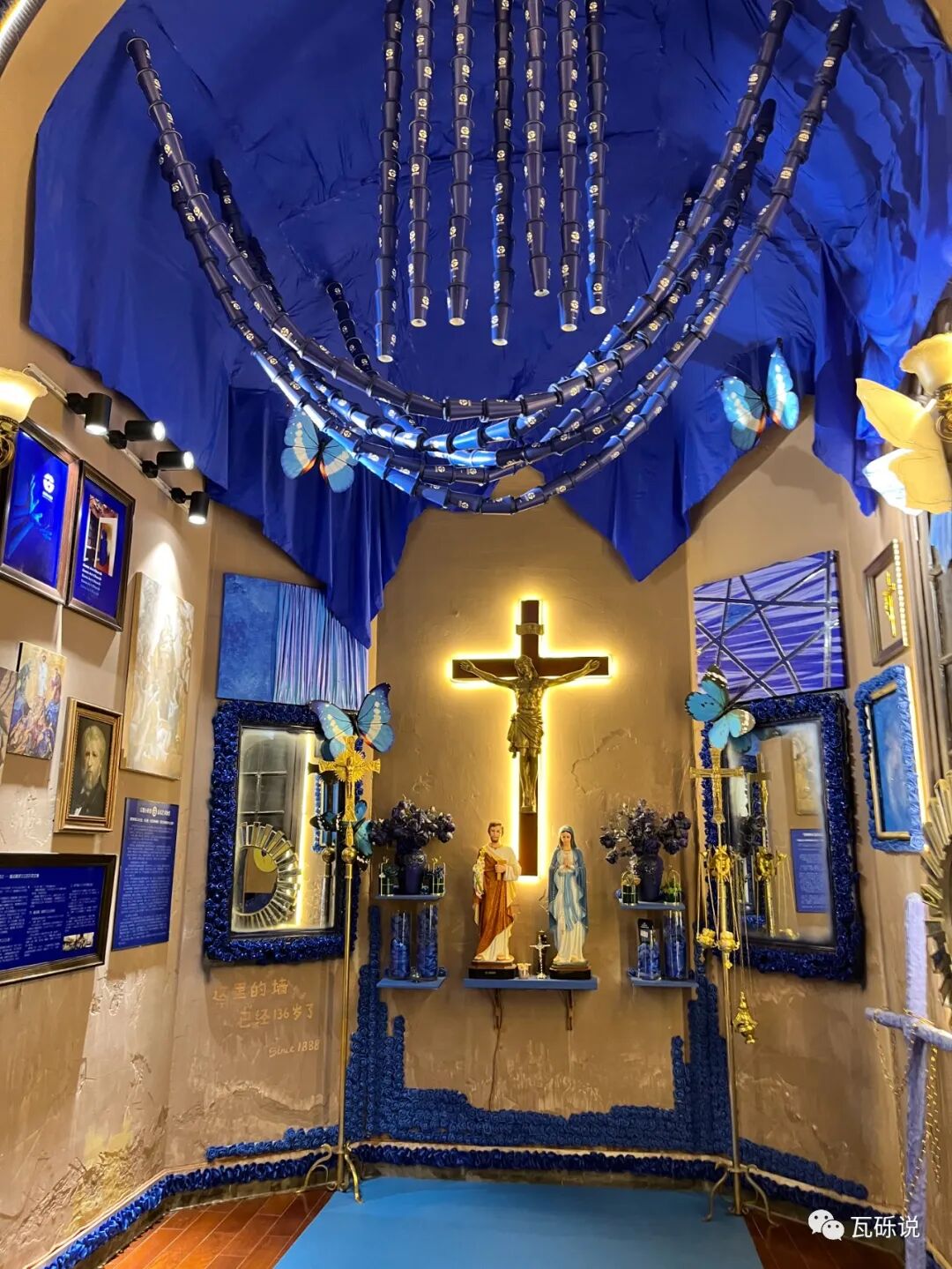 🦋顺着玫瑰阶梯上去是以前的教堂,现在是“蓝蝴蝶艺术馆”,可以参观拍照(门票白天9.9元、夜场19.9元。推荐白天去,和夜晚比景色没什么差别)、艺术体验(Diy制作单独收费)、活动沙龙和婚礼派对(收费咨询工作人员)。里面有很多蝴蝶标本,展出的蝴蝶标本均可售卖。