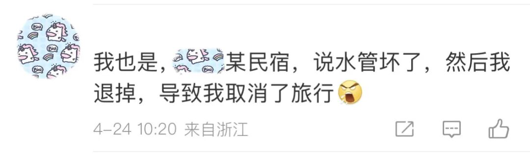 之前公众对民宿的不信任的部分原因是货不对版的照骗,现在加上没契约精神的毁约,酒店刺客已经明晃晃地变成了强盗。客人敢怒不敢言,个别民宿主更加张狂起来,不择手段地卖高价。