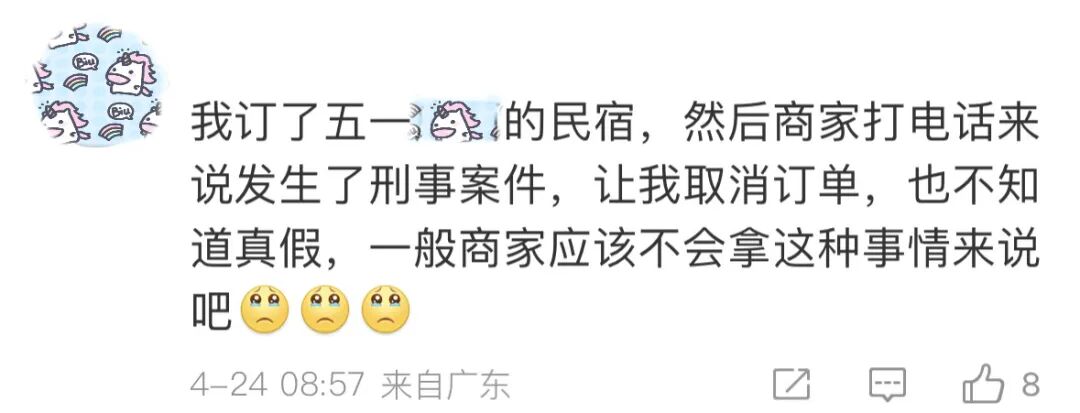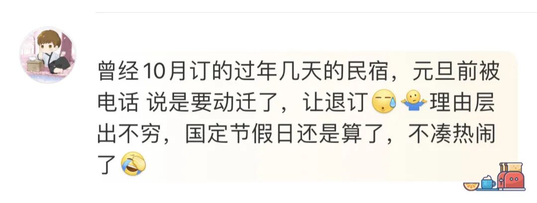 与邓女士情况类似,在住宿需求高峰前夕遭遇民宿“毁约”的网友居然不少。一些民宿视市场需求坐地起价,劝退客人的理由包括但不限于装修、倒闭、转让、老板换人、楼下住户严重投诉。