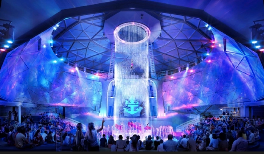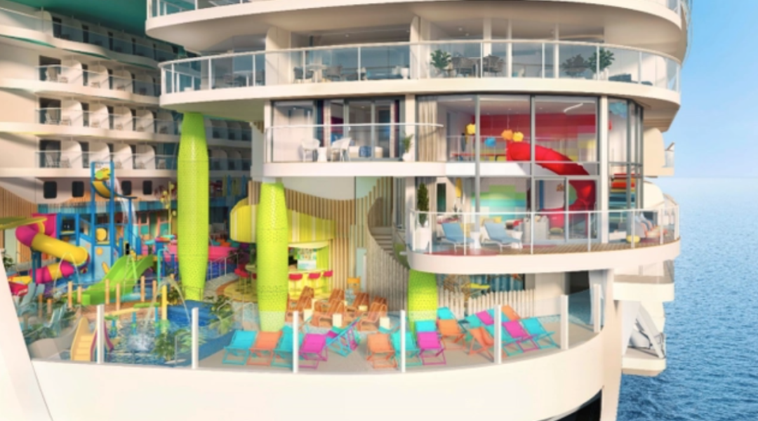 官方宣传中就提到不少娱乐设施的“设计之最”。比如,海洋标志号拥有邮轮界最大的水上乐园,最高的瀑布景象,以及史无前例的第一个悬挂式无边泳池。它的6 个水上滑梯中,包含了业界首个开放式66°自由落体滑梯、海上14米最高落差滑梯、首个邮轮上的4人家庭筏滑道和首个游轮双人组队竞逐滑道。