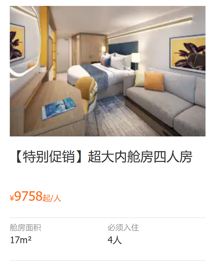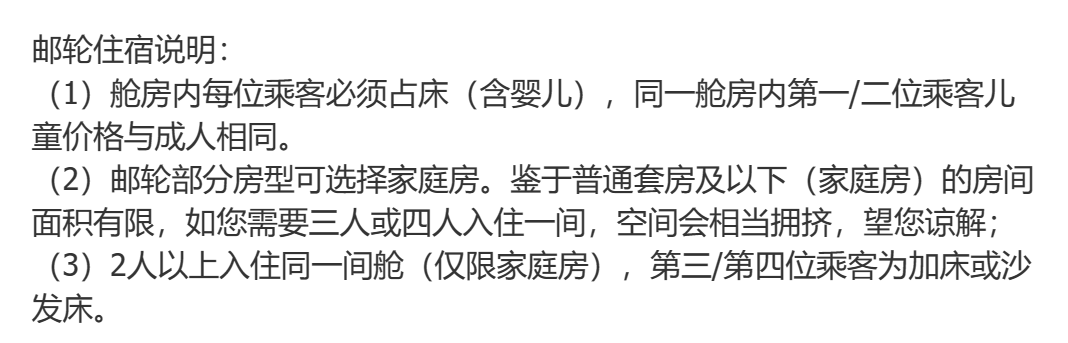 另按邮轮规定,舱房内每位乘客必须占床(含婴儿),同一舱房内第一/二位乘客儿童价格与成人相同。所以如果24㎡真的挤进去4人,官方警告:空间会相当拥挤。