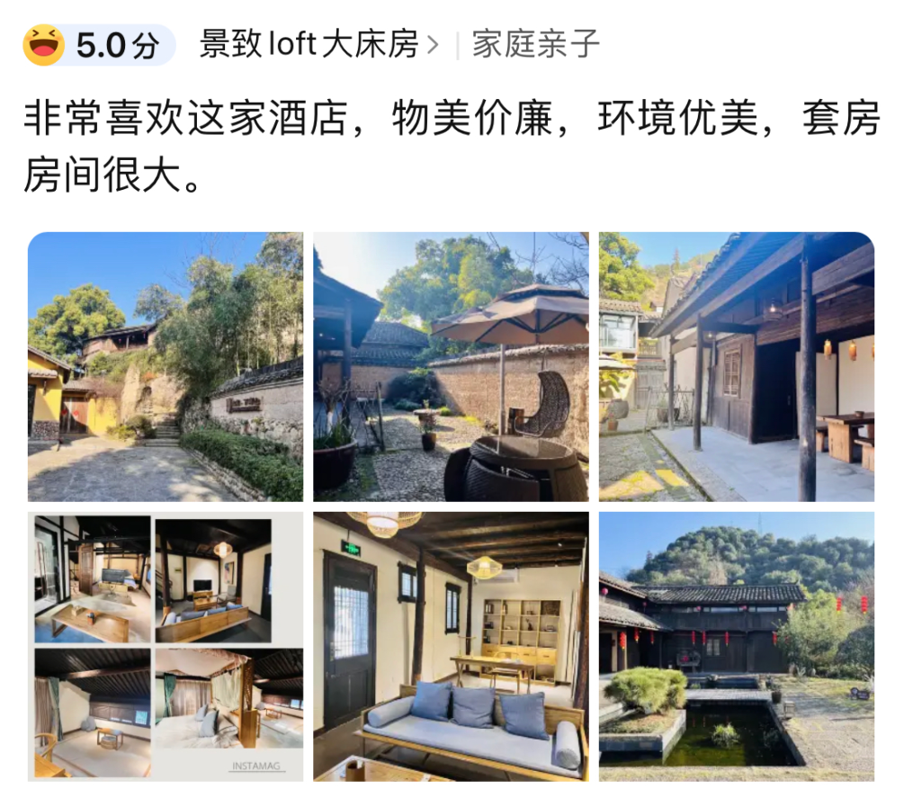 这类隐世风酒店一般体量不大,设计主题围绕山水、田园、村落等。客房以外其它配套设施不用太精致,哪怕是“青菜萝卜糙米饭,瓦壶天水菊花茶”也能获得青睐。酒店爆火的流量密码包括但不限于:出片、亲自然、文化底蕴、达人打卡······