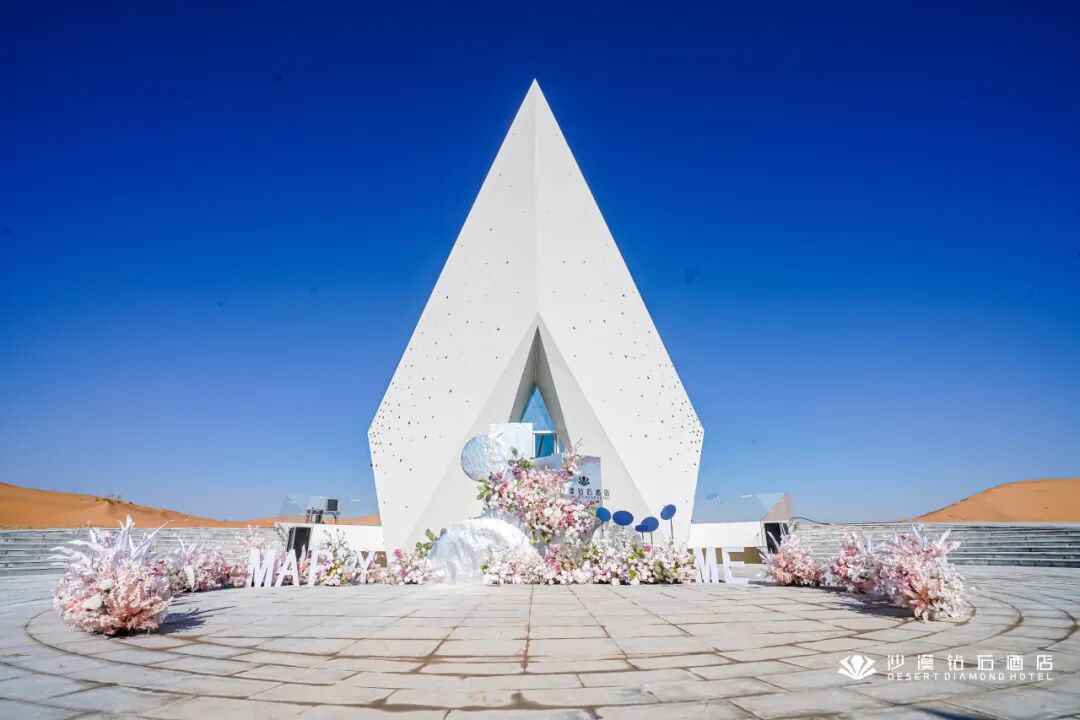 此外,作为与星星酒店相邻的沙漠钻石酒店,其中包括度假套房30套、婚礼礼堂和配套景观。酒店借以“钻石”的纯净、坚固、永恒属性,将“钻石”的内涵外延与沙漠自然景观相融,可有力满足高端客群对“品质与野奢”的追求。主体建筑高29.17米,是星星酒店的升级,也是“宁夏星星故乡”品牌IP的又一代表,具有标准化、现代化、服务精准的优势,可吸引全世界游客前来度假。