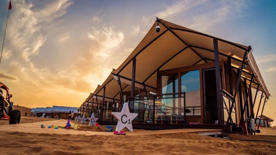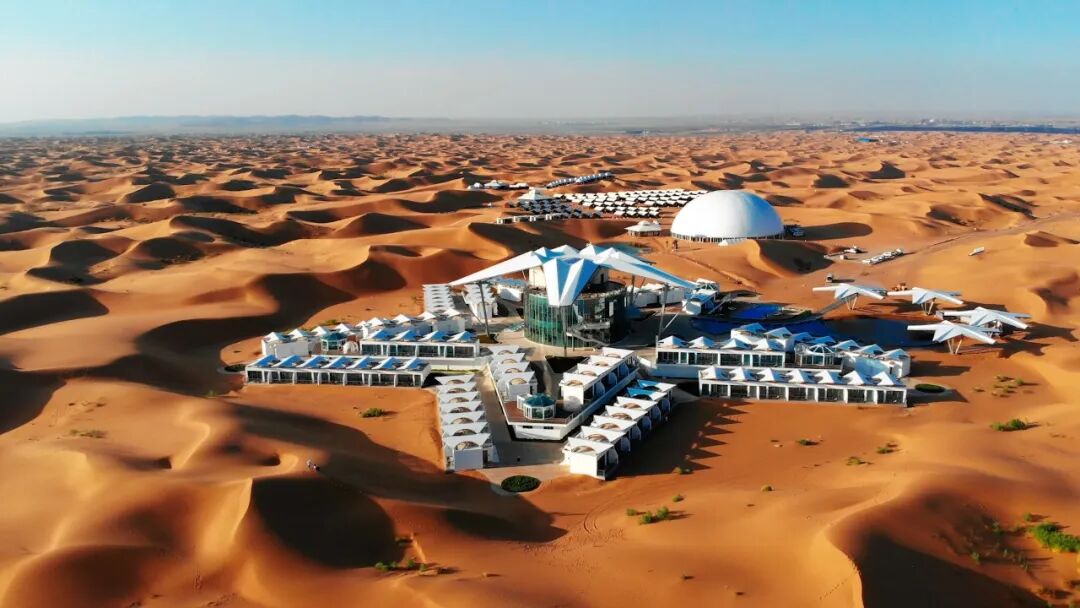 8公里的腾格里沙漠深处,以五角星形状规划设计,从空中俯瞰正形如一颗颗星,这是全国首家以沙漠星空为主题的酒店,在这里,头枕大漠、沐浴星河不是梦想。与之比邻,沙漠钻石酒店进入建设尾声,开业在即。