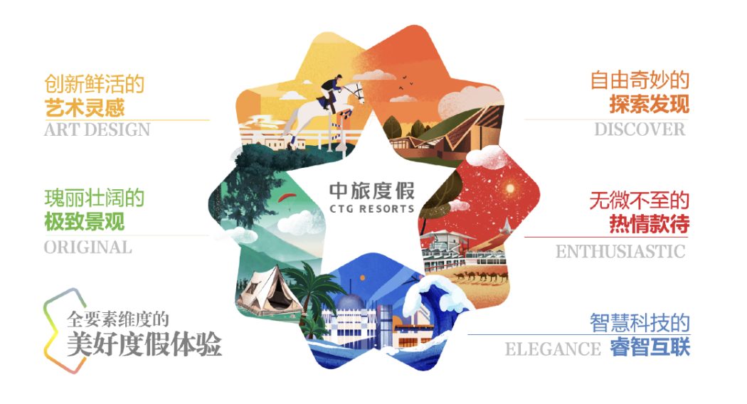 “中旅度假”作为中旅国际旗下度假目的地品牌,以度假区和度假酒店为核心业务。以中国旅游集团五色花环组成的标志为灵感来源,主张“向生活的至美处进发”,传递出“人生至美 缤纷自在”的情感价值,希冀在度假中带来缤纷多彩的美好体验及快乐鲜活的生活享受。