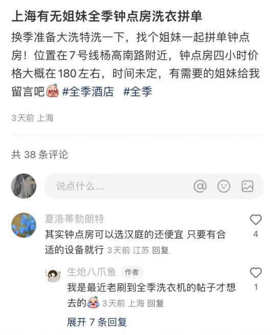 除了基本洗衣需求外,大学生成为了去酒店洗衣的一大群体。大学寝室没有烘干机,洗衣机也少,而在二三线城市,一两百元的价格就可以住到专门提供洗烘合一服务的酒店,对比干洗店来说显得更为划算。在这一需求的促使下,大量大学生开钟点房跑去酒店洗衣服,甚至亲切的称呼全季等酒店为大学生的洗衣房。