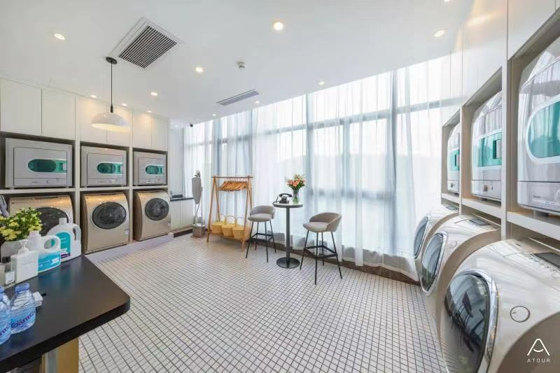 酒店的自助洗衣房也在不断升级当中,布局设计都包含着酒店的考量。自助洗衣房大多分为了独立的净衣区、脏衣区,甚至一些酒店还有晾晒区域,并提供水沙发给那些可能要等待洗衣的客人。洗衣房的设计风格可以展现酒店的文化,比如亚朵的洗衣房装修风格很统一,黑白灰的基调搭配上木质元素,让人感到温馨平和。