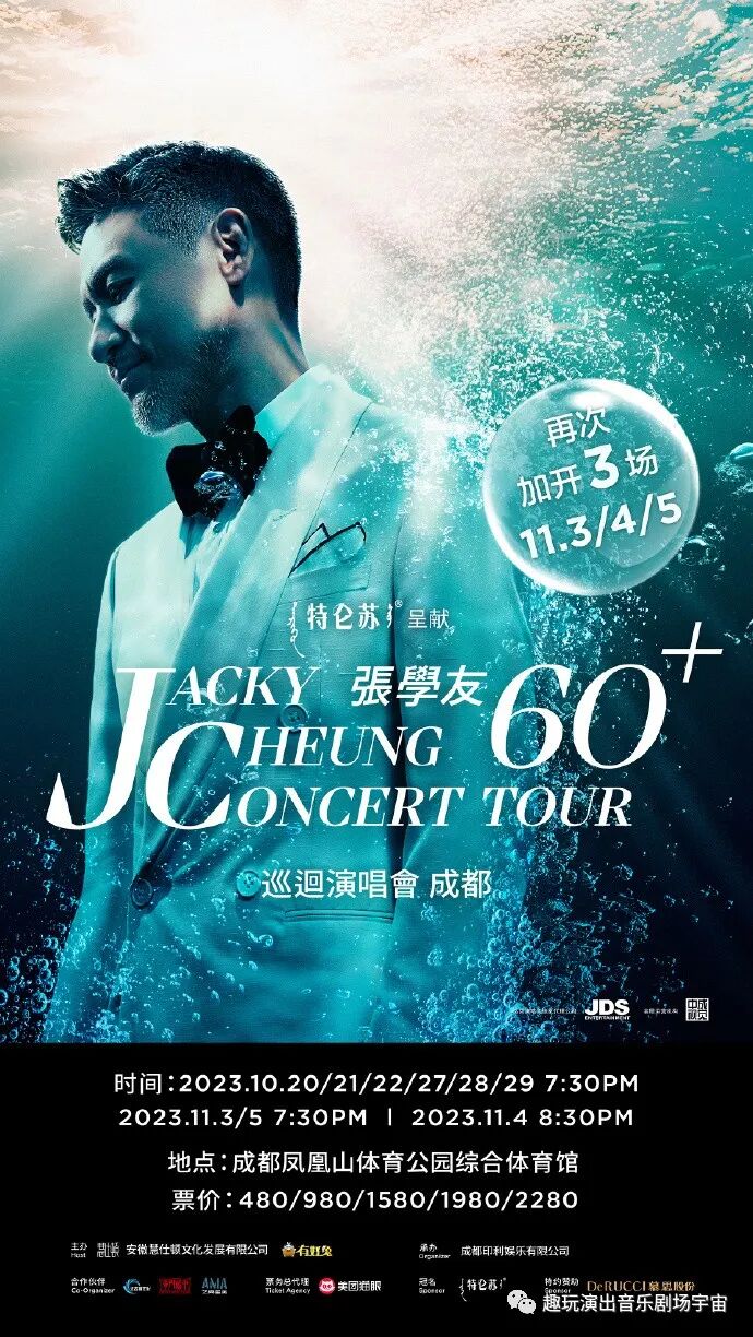Jacky Cheung 60+ Concert Tour张学友60+巡回演唱会-成都站,今日13:18最后一轮开票!11月3日、4日、5日三场连开~9天9夜的狂欢即将上演,心中的经典将响彻在最难忘的音乐之夜。