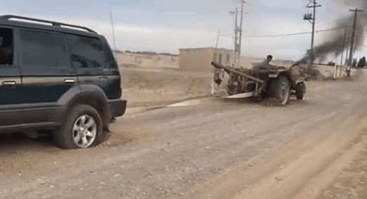 比如上图这辆小四轮,挂上农具增加轮胎摩擦力以后与四驱的硬派越野车普拉多拔河也丝毫不落下风。