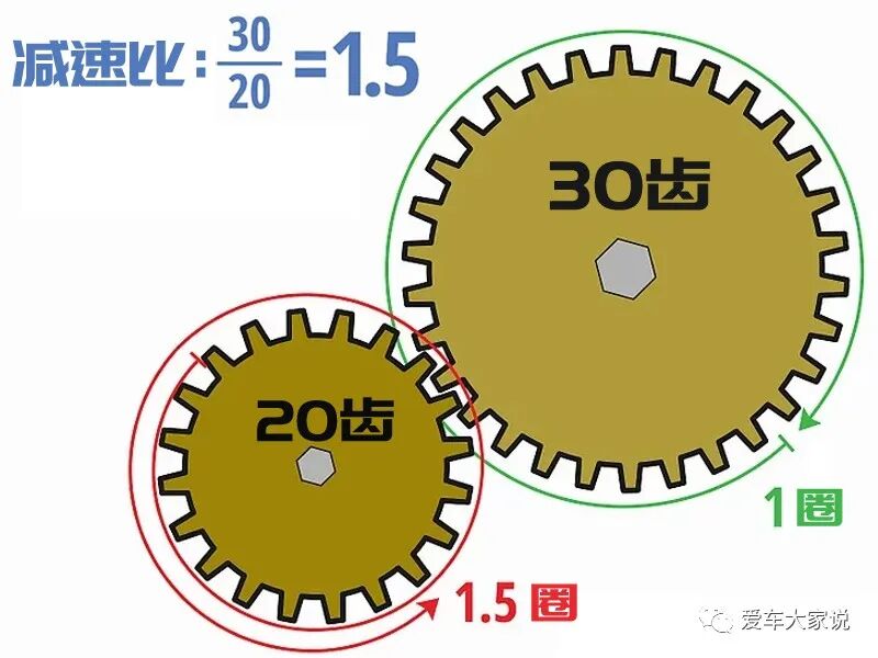什么是减速比呢?比如上图,用一个20齿的齿轮驱动一个30齿的齿轮,这属于小齿轮驱动大齿轮的结构,可以放大扭矩,它的减速比就是30:20,等于1.5,也就是说这个传动组合可以把扭矩放大1.5倍。减速比越大,齿轮组对扭矩的放大倍数也越大。