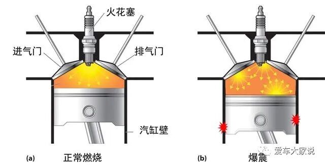 但是提前点火也有风险,那就是爆震。什么是爆震呢?简单来说就是混合气燃烧太猛烈,不受控制了,像爆炸一样。因为正常情况下火花塞点火后混合气只有一小部分被引燃,这部分火焰向外传播,继续引燃其他混合气,这样气缸内压力上升很平稳。而爆震指的是火花塞点火后所有混合气瞬间同时剧烈燃烧,这种燃烧就像爆炸一样,此时活塞正在向上压缩,剧烈的冲击力会阻碍活塞运动,甚至会损坏发动机,这就叫做爆震。爆震不仅仅会增加油耗降低动力,还可能损坏发动机。