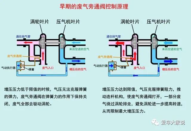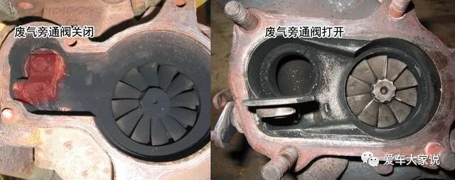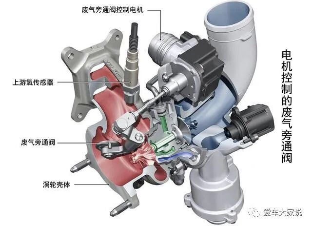 增压器的涡轮旁边有一个废气旁通阀,在不需要增压的时候旁通阀会打开,一部分废气会绕开涡轮,从旁通阀直接流走,这样可以降低排气阻力。当需要增压的时候旁通阀关闭,废气集中火力驱动涡轮,增压器就可以提供足够的增压压力了。
