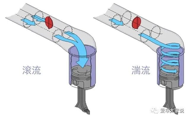 在进气冲程进气门打开,气流快速进入气缸,在碰到气缸壁和活塞后气流会在气缸内翻滚运动,这个运动可以快速打散汽油,促进其蒸发并且与空气混合。