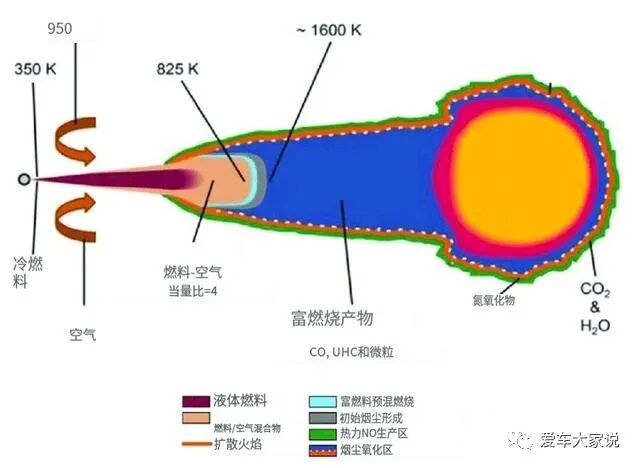 喷油时柴油在高压作用下从喷油嘴喷出,形成一团油雾,油雾外部的柴油首先接触空气得到氧气,所以它们先燃烧。等它们燃烧完后油雾团内部的柴油也开始接触空气并持续燃烧,这样就可以保证燃烧平稳,发动机稳定工作。
