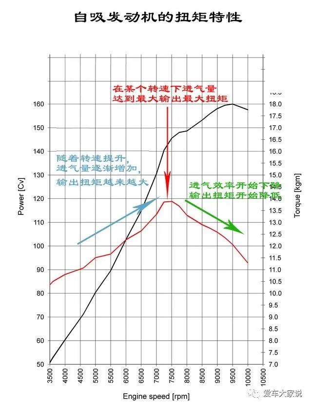 自然吸气发动机是靠活塞往气缸里吸气的,低转速时活塞速度慢,气流速度低,所以进气量小,扭矩自然就小。