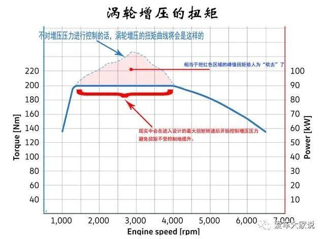 所以工程师就对增压压力进行了控制,在输出最大扭矩的瞬间控制系统就开始控制增压压力了,随着转速的提升,一点点打开涡轮废气旁通阀,留够一定废气保证增压压力不变以维持当前的最大扭矩,剩下的废气都从旁通阀里直接进入排气系统了。因此才出现了增压发动机的最大扭矩平台。