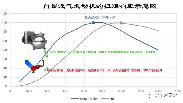 在行驶中如果我们猛地把油门踩到底,那么节气门会瞬间全部打开,要知道大气压力是时刻存在的,节气门打开的瞬间大气压力就可以给发动机“增压”了,所以自吸发动机猛踩油门后几乎是同步输出当前转速下的最大扭矩。