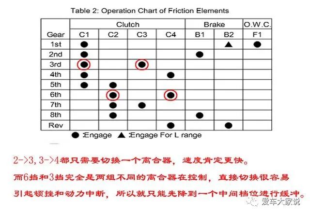 对于AT变速箱也是一样,不同档位由不同的离合器、制动器控制。如果要切换的两个档位使用的是完全不同的离合器,那么也无法直接跳跃式一步到位,也要拉一个中间档位来缓冲一下。