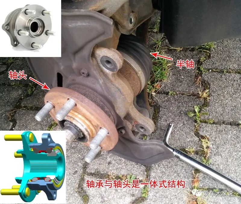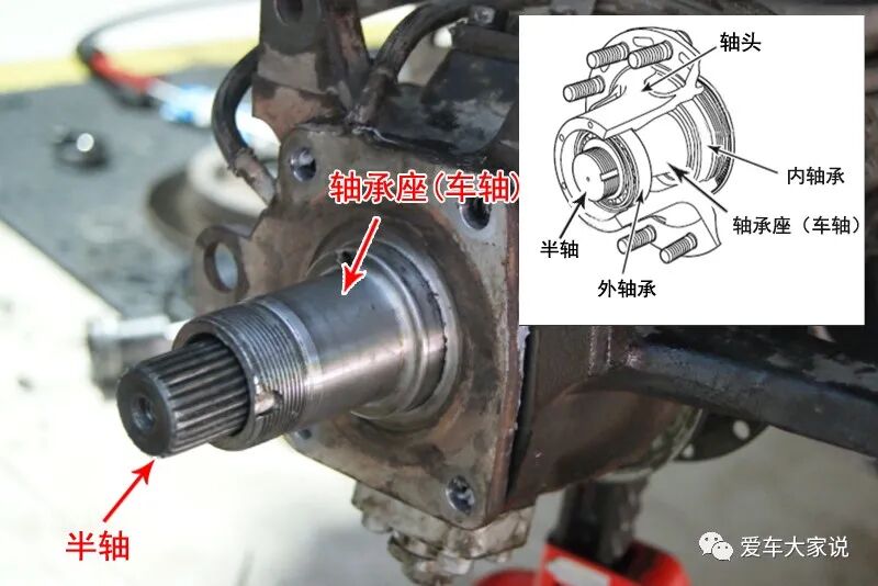 比如上图就是一个实物图,轴头通过轴承套在车轴上,半轴从车轴中间穿过来通过法兰盘与轴头连接传递动力,车轮再安装到轴头上,这样半轴的动力就传递给车轮了。