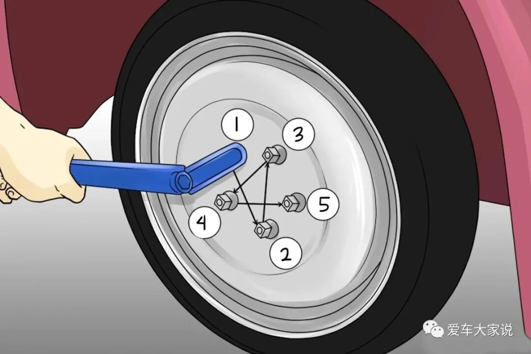 我们自己换备胎的时候一定要注意轮胎螺丝的拧紧顺序,不能挨个拧。一般都是以对角线位置来拧。