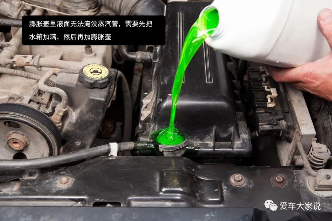 如果冷却液液面已经低于蒸汽管口了,那么散热系统温度降低时就无法吸到冷却液了,可能会直接把空气吸进去,这时候散热系统内部可能就会缺冷却液。所以此时应该先打开水箱盖,把水箱里加满冷却液,然后再补充膨胀壶里的冷却液。