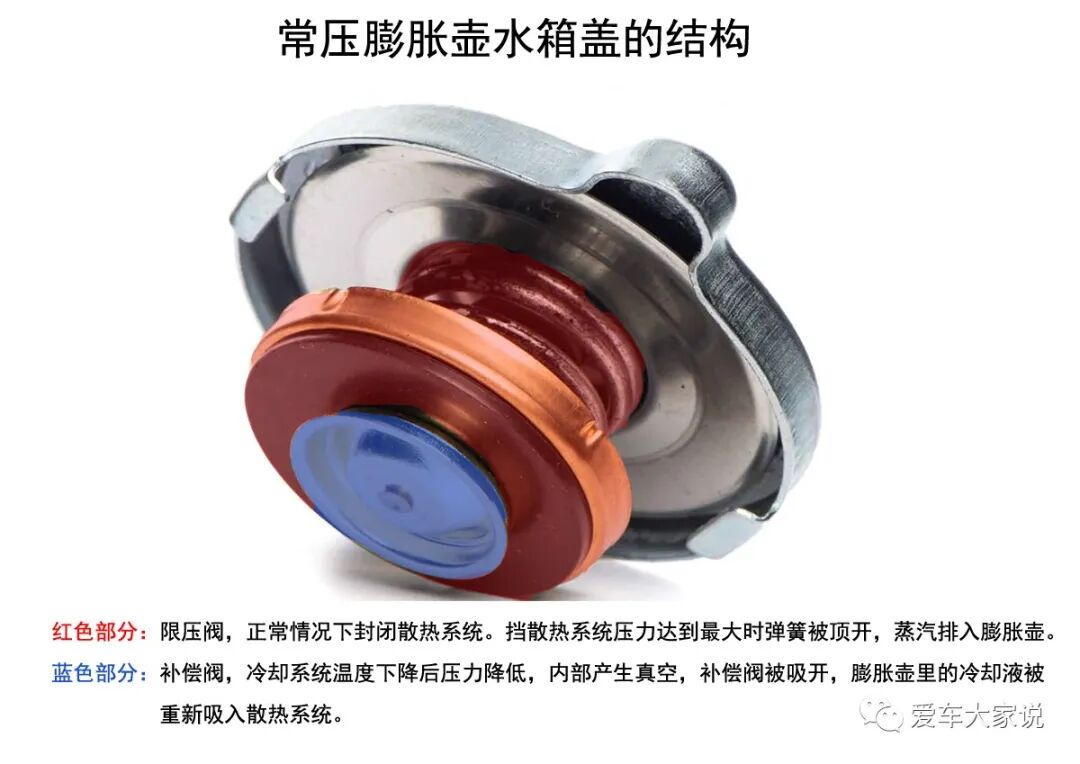 所以散热系统上会设计一个限压装置,当系统压力超过安全值的时候把多余的蒸汽给排放出去。这个限压装置就是水箱盖,它内部有弹簧,压力超过安全压力后弹簧被顶开,蒸汽就可以排出去了。