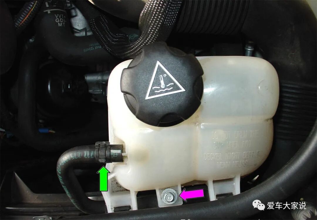 常压膨胀壶和高压膨胀壶很好区分,常压膨胀壶的盖子是直接扣在膨胀壶上面的,用手一掰就可以取下来,而且盖子上一般会有两根管子,一根是蒸汽管,它一头埋在膨胀壶的冷却液里,另一头连在水箱盖下方。另一根是通气管,直接通大气。