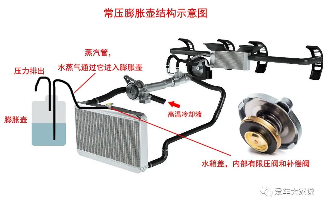常压膨胀壶虽然可以收集蒸汽,但是由于它与大气直接连通,膨胀壶内的冷却液也会慢慢蒸发导致损耗,导致膨胀壶里的冷却液逐渐减少。