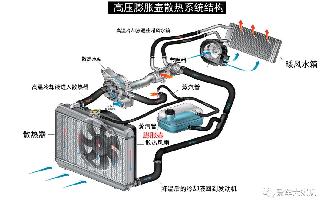 汽车散热系统是一个密闭的系统,工作时随着水温的升高,散热系统内部会产生很多水蒸气,它会使散热系统的压力升高,而且还可能产生气阻,影响冷却液循环效率。