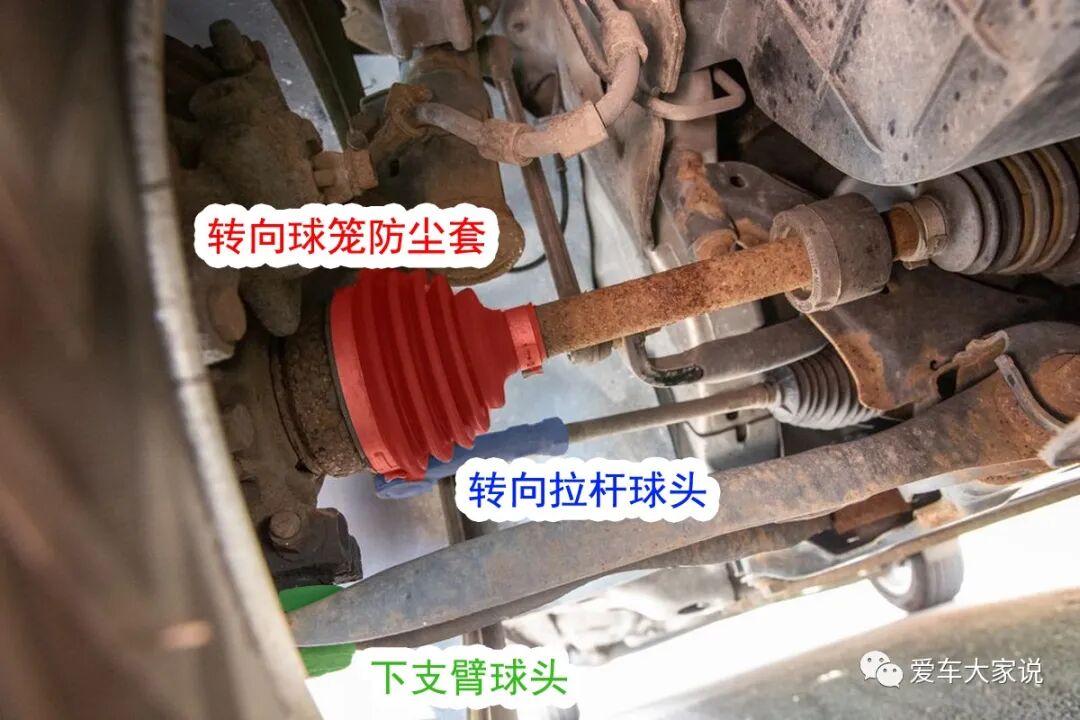 悬挂系统的下支臂球头、胶套;转向拉杆球头、转向拉杆防尘套;传动系统的转向球笼防尘套,它们都低于半个车轮的高度。