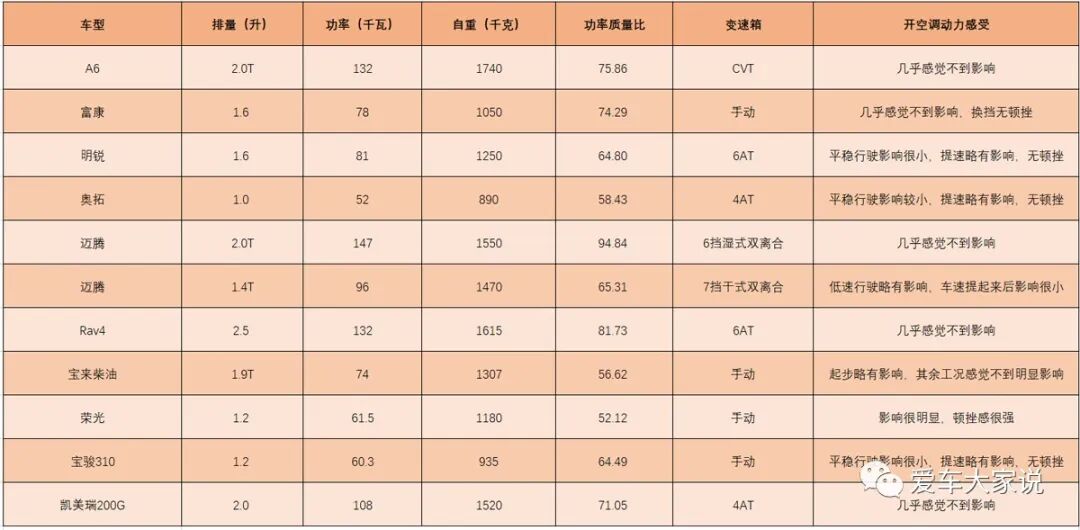 从表格里可以看出来这样一个规律:比功率大于60的车,开空调后动力都不会有明显下降,或者说开空调对动力的影响完全在驾驶员可以接受的程度以内。如果比功率大于70的话开空调的影响就更小了。比功率大于80的话那几乎是感觉不到影响。