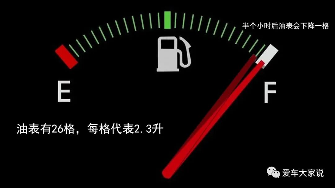 假如该车油箱容积为60升,油表指针有26格,每格代表2.3升,也就是1725克。那么汽车行驶27.6分钟刚好消耗掉1725克汽油,此时油表指针就会下降一格。当然了这只是形象的比喻而已,现实中油表的显示要比这复杂一些。