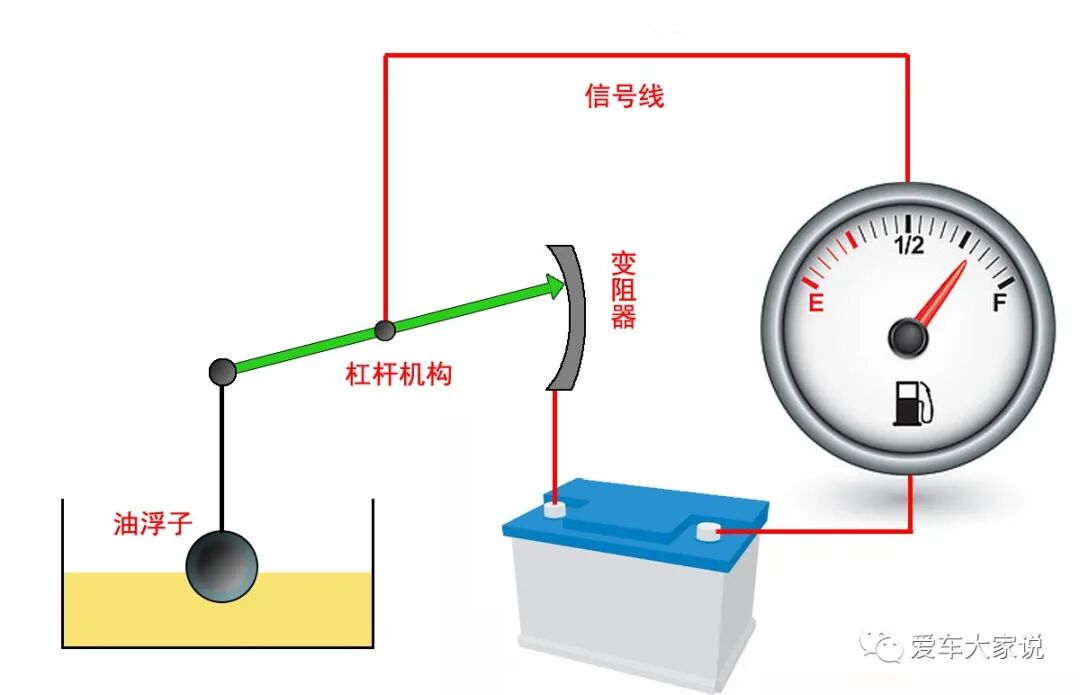 汽车油箱里有一个油浮子,它在油液浮力的作用下飘在液面上方,油浮子又连着一个变阻器,检测电路通过变阻器的电阻就可以间接计算出剩余油量了。