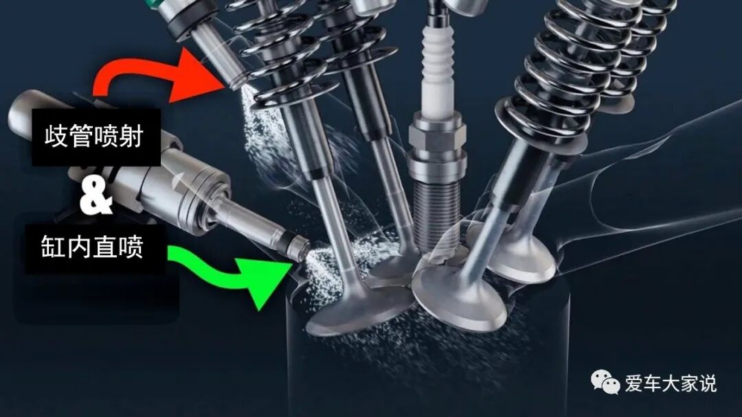 一个是如今比较流行的混合喷射,把缸内直喷和进气歧管电喷结合起来,低转速用直喷,高转速配合电喷就可以实现更高的转速了。