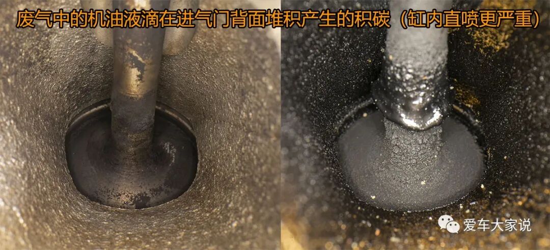 由于曲轴箱废气里含有大量机油蒸汽,所以在曲轴箱废气出口有一个油气分离器,负责把废气里的机油给过滤掉,以免机油进入燃烧室。但油气分离器是无法100%过滤干净的,所以仍然会有一部分机油蒸汽随着废气从进气歧管经过进气门最终进入燃烧室。随着发动机工作时间的增加,进气歧管、进气门背面、燃烧室里就会因为机油蒸汽的影响而出现积碳。