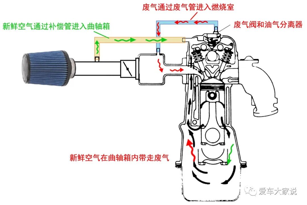 曲轴箱通风系统简单来说就是在曲轴箱上接两根管子,一根连着发动机进气歧管,叫废气管,发动机工作时通过废气管把曲轴箱里的废气吸入燃烧室烧掉。而另一根管子连在节气门与空气滤芯之间,叫补偿管,负责给曲轴箱补充新鲜空气。