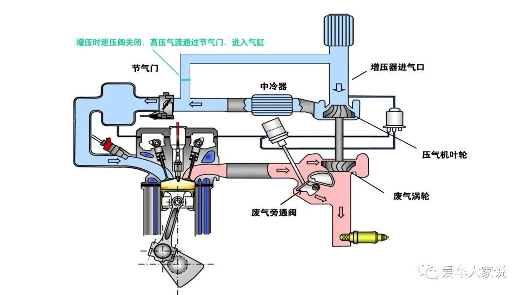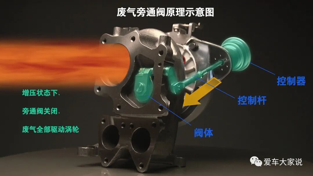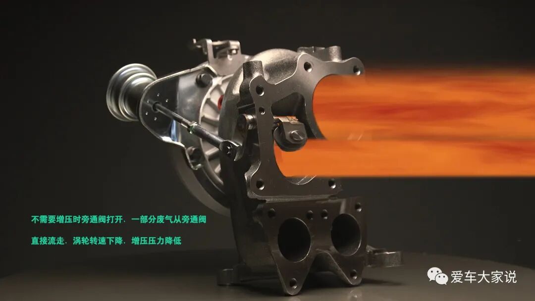 在不需要增压的时候废气旁通阀就会打开,让大部分废气经旁通阀直接排放到排气管中,这样涡轮那里没有足够的驱动压力,只能转着玩儿,发动机就不增压了。