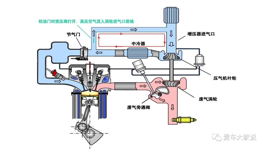 在踩油门时节气门打开,被增压的空气快速通过节气门流入气缸。当司机松油门时节气门瞬间关闭,进气通道被阻断。但是增压器并不会立马停下来,此时高速流动的高压空气被节气门突然阻断,就会对涡轮和节气门产生很大的冲击,而且还会使涡轮转速骤降,再次踩油门时涡轮迟滞更明显。