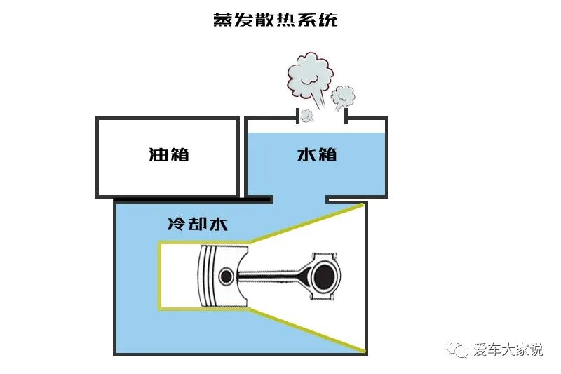 柴油机使用的是蒸发式散热系统,柴油机顶部有个水箱,水箱下方与发动机冷却水套是相连通的,水箱上方是开放式的。冷却水没有沸腾时会不断吸收发动机产生的热量,冷却水沸腾以后则通过水箱的开放口开始蒸发,靠冷却水的不断蒸发把热量继续向外传递,因此在冷却水沸腾后仍然可以给发动机散热。