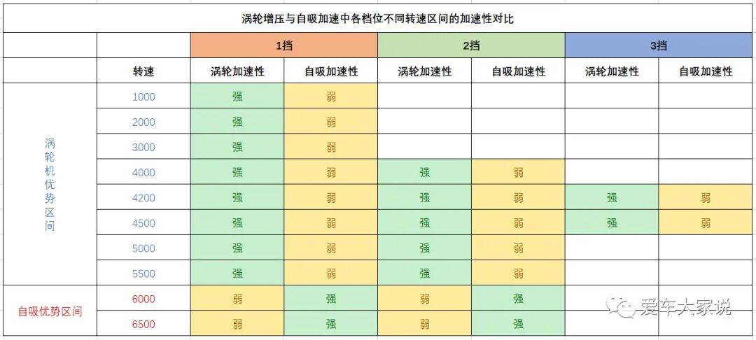 由此可见,自吸机虽然最大功率很高,但是由于中低转速扭矩不足,导致这个区间功率远低于涡轮机。而加速时这个区域使用频率却很高,这样自吸机就不占优势了。