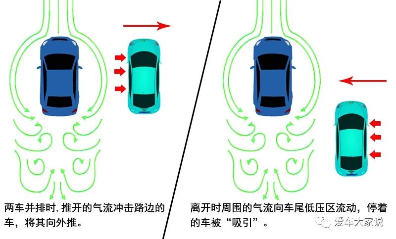 最明显的例子就是车停在路边,旁边有车高速驶过,其车头推开的气流会对我们的车身产生冲击,车身有被推开的趋势。而这辆车离开的时候四周的空气开始快速向其车尾流动,我们又会感到车身被吸引过去。